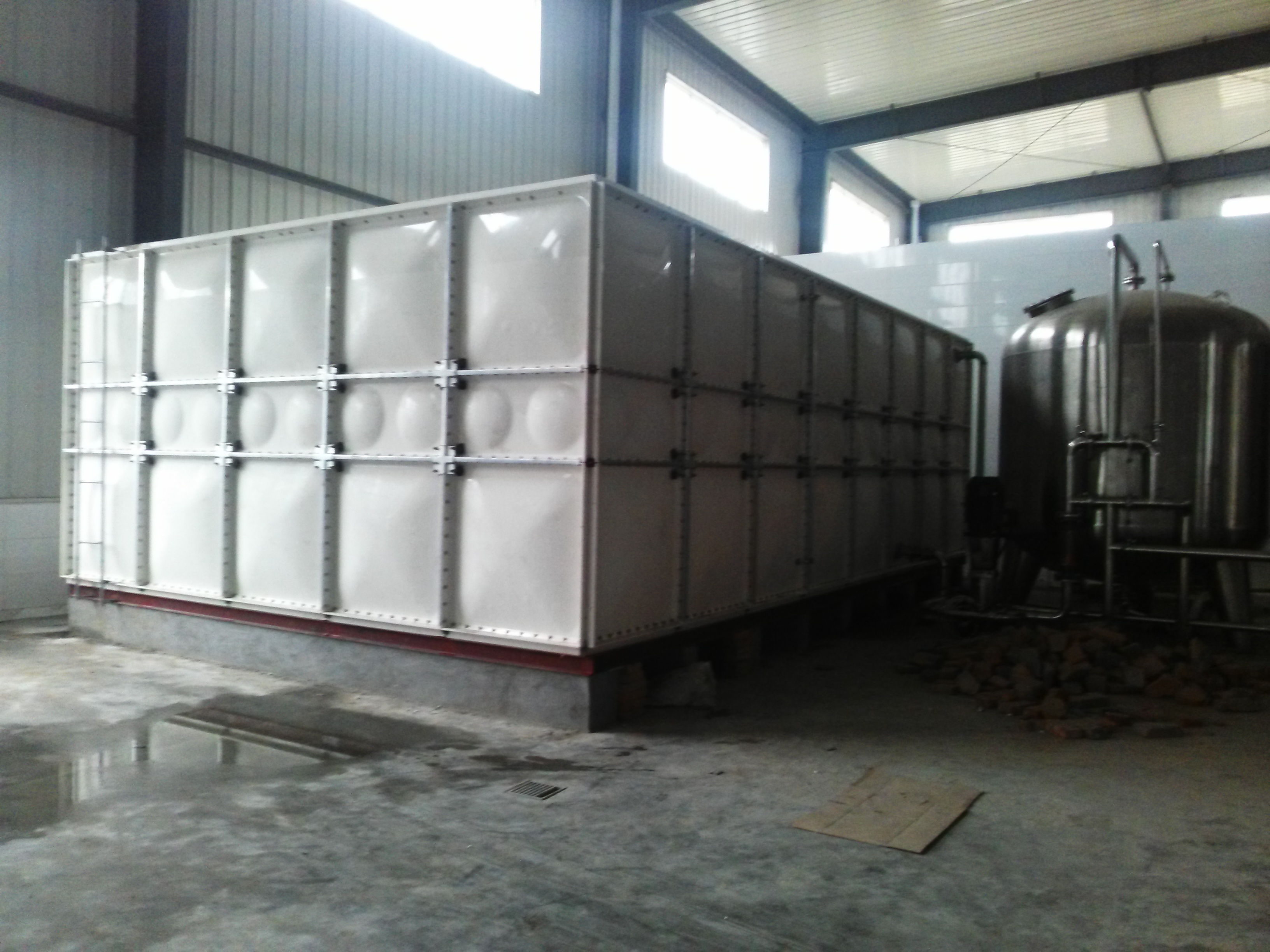 模壓SMC玻璃鋼水箱是目前采用的新型水箱。玻璃鋼水箱的原材料SMC模壓單板是采用不飽和樹脂生產的SMC片材,經高溫、高壓、機械壓制而成。在制造工藝上采取機壓成型的制作方法。增加了抗震、抗沖擊的強度、克服了手糊制品強度不均勻的缺陷,提高了耐壓強度和使用壽命;在外型設計上,板塊中部呈凹陷弧度,提高了玻璃鋼水箱的承壓能力,同時板塊四周設有45度和90度的凸緣,組裝時不用邊角連接件,更具有柔韌性和靈活性,