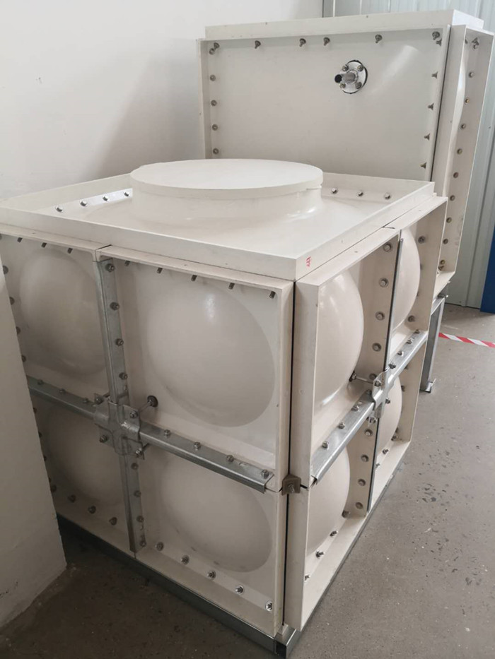 玻璃鋼水箱在安裝前,先要檢查水箱混凝土基礎表面是否平整,然后按照玻璃鋼水箱底板尺寸,將已經截好的槽鋼進行焊接組合,然后開始組裝玻璃鋼水箱板,玻璃鋼水箱板與玻璃鋼水箱板之間中間夾密封條,以螺栓連接。先將底板組裝完畢平鋪到槽鋼底座上,然后將側面組合與底部連接。連接完畢后,開始安裝拉筋,先在四塊側板的十字結合點處安裝拉筋板,在四塊板靠角處鉆好孔,用四根對絲,穿過內外拉筋板,把四塊板夾緊,螺桿與板之間要夾膠墊密封,把拉筋帶螺紋的兩端穿過拉筋板中間孔,用螺母將兩塊內拉筋板拉緊。玻璃鋼水箱還有專門的堵漏原件,它主要用于底板和下側板四塊板結合處的菱形孔洞及側板四角中間結合處的菱形空洞密封,在外緊固并且由內向外穿。