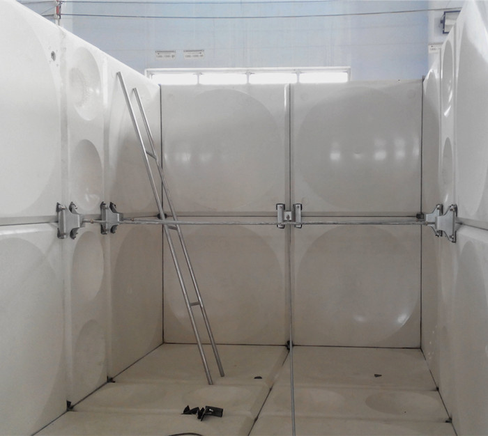 3:拉筋。如果僅僅用水箱板和膠條組成我們需要尺寸的水箱,雖然不透水了,但是還不能盛水,因為盛水之后水箱會承受一個向外的張力,必須加上拉筋系統受力,否則玻璃鋼水箱會形成一個高力矩體系,很容易撐壞。拉筋系統有圓鋼,內外拉筋板,對拉螺栓。