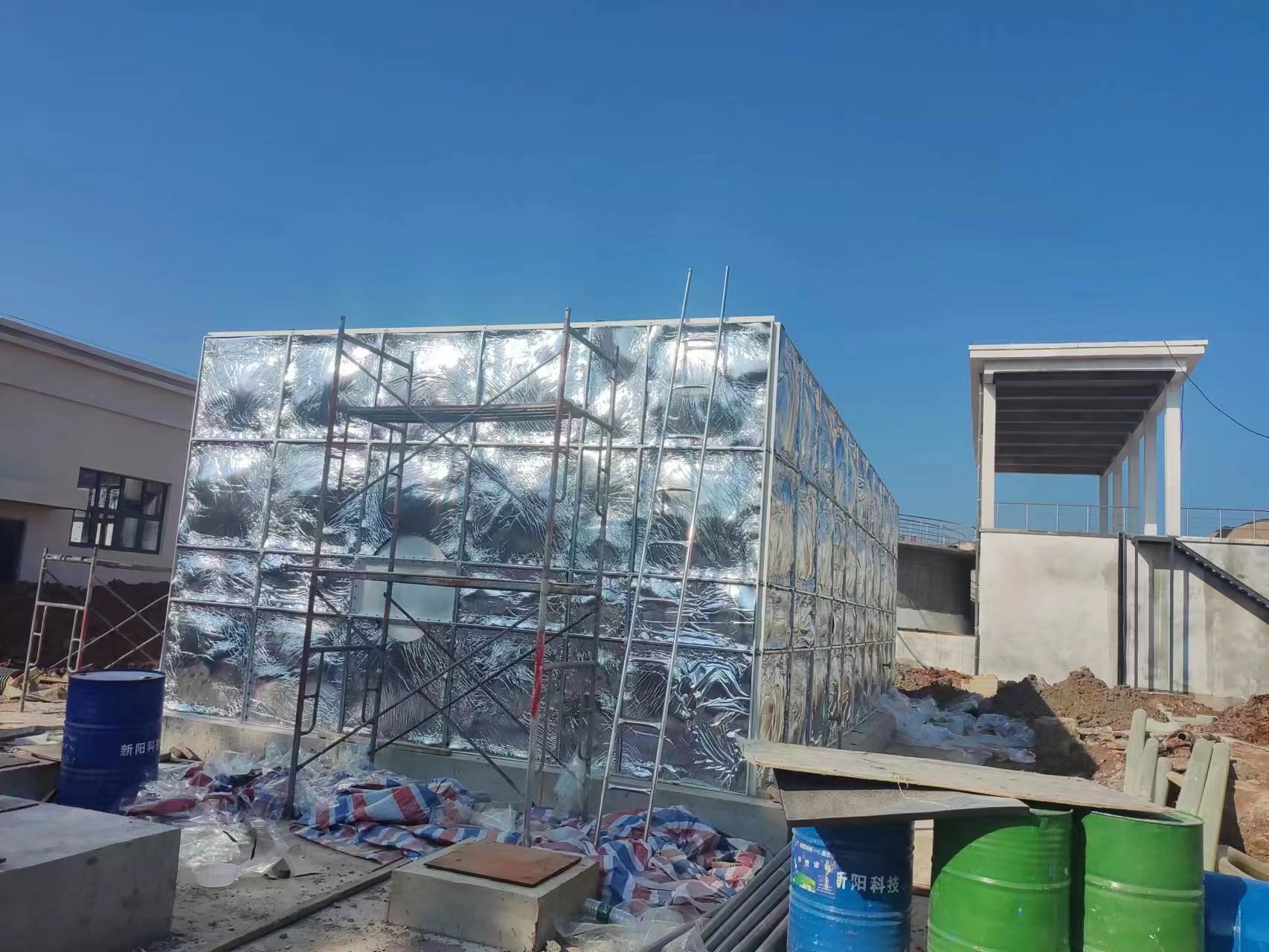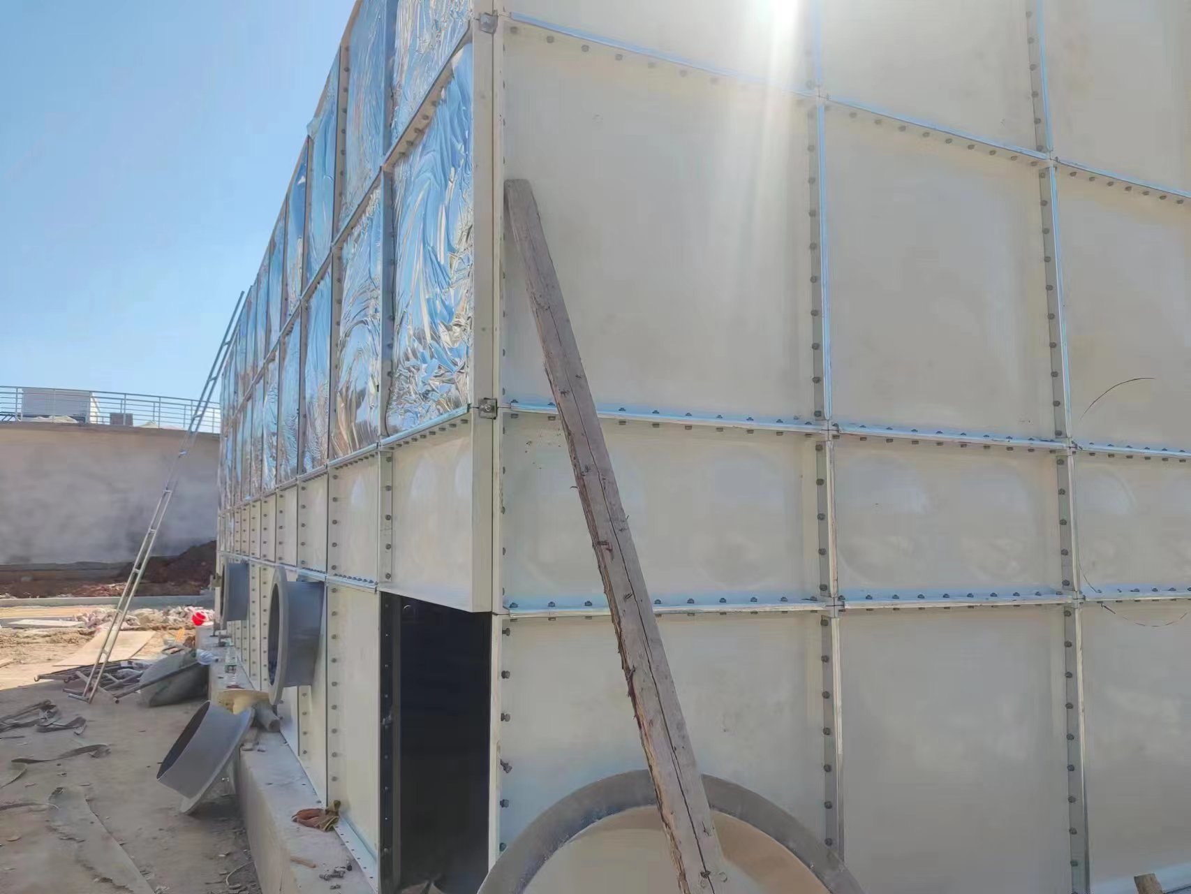 我公司承接的江西省吉安市污水處理廠221立方玻璃鋼保溫水箱已經安裝試水完成,此次水箱佯作空氣凈化過濾專用箱體使用。當地冬季溫度較低,防止上凍,在水箱外層采用的是5公分橡塑鋁箔布保溫。現場安裝圖如下: