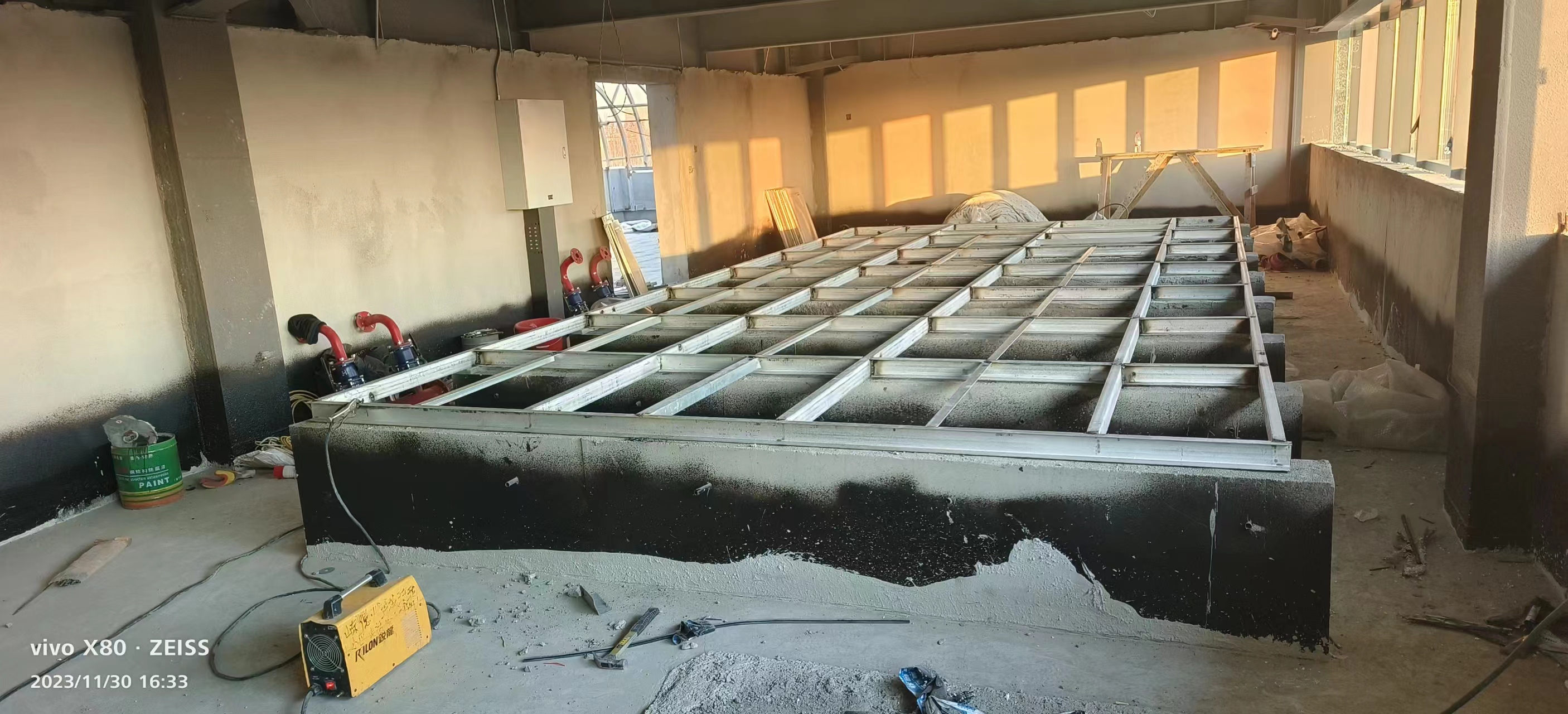 1、槽鋼基礎(chǔ)焊接:工作人員將測量并尋求等通道切割和焊接。制作一個(gè)間距為一米的網(wǎng)格式通道底座,以便水箱的順利組裝。
